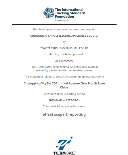 繼我司獲得市級綠色工廠后,配合DENSO碳中和規(guī)劃,我司已獲得I-REC證書,并購買了覆蓋公司電力以外排碳量的碳積分數量。